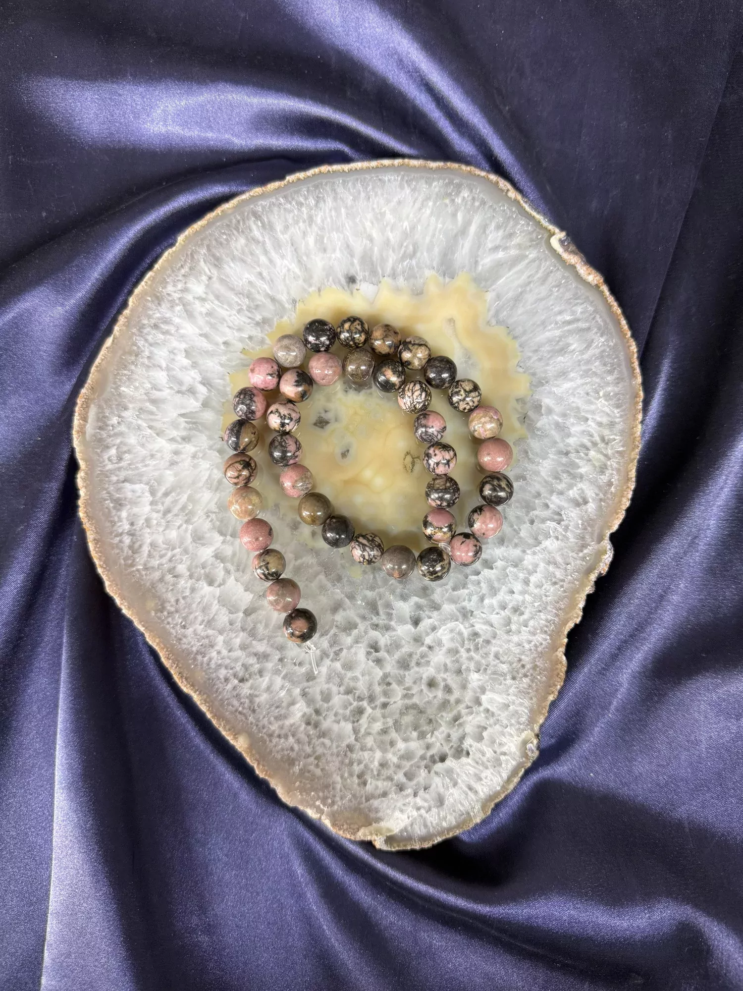Rodonit, pembe tonlarıyla dikkat çeken ve genellikle siyah damarlarla süslü olan bir silikat mineralidir. Sevgi, şefkat ve duygusal denge taşı olarak bilinir.